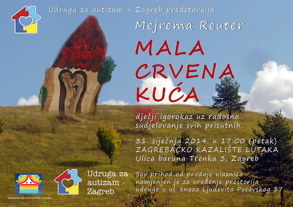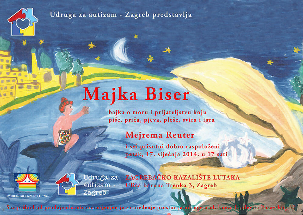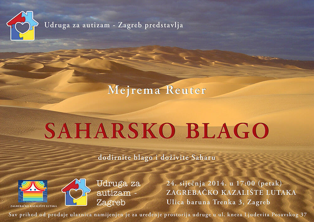 Udruga za autizam – Zagreb predstavlja tri predstave Mejreme Reuter u siječnju, u Zagrebačkom kazalištu lutaka. Riječ je o interaktivnim predstavama gdje je publika pozvana da sudjeluje i tako izravno postane dio kreativnog procesa u stvaranju glazbeno – scenskog doživljaja u kojem su potrebni samo dobra volja i pregršt mašte. U sklopu njezinog životnog projekta Umjetnost u terapiji, kojeg već dvadesetak godina implementira na tri kontinenta, među djecom i odraslima, ova akademska umjetnica, edukator i terapeut želi pomoći Udruzi za autizam – Zagreb da prikupe sredstva za obnovu prostorija u ulici kneza Ljudevita Posavskog 37 u Zagrebu u kojima će se odvijati rad udruge. Mejremina velika želja je da kreativna terapija zaživi na toj adresi upravo onako kako je zaživjela na svim mjestima gdje ju je kreirala. I da se širi. Kao i prijateljstvo. MALA CRVENA KUĆA je prva predstava u nizu koja će se igrati u srijedu 15. siječnja i u petak 31. siječnja s početkom u 17 sati. To je priča o kući bez vrata, bez prozora sa dimnjakom u sredini i sa zvijezdom unutra. Stekla je veliku popularnost ne samo među djecom, nego i roditeljima, jer nakon predstave djeca jedu voće bez da ih se na to posebno nagovara. MAJKA BISER će se igrati u petak, 17. siječnja u 17 sati. To je bajka o moru i prijateljstvu. Majka Biser je najveći i najljepši biser na dnu mora koji je san svakog lovca na bisere. Jedan od njih je i dječak koji zajedno sa svojim ujakom prvi put ide u lov. Sve što je lijepo i željeno ima svoju tajnu, a svaka tajna u sebi uvijek nosi i elemente opasnosti. U potrazi za svojim snom dešava se nevolja, dječak upoznaje pravog prijatelja, dupina, koji mu pomaže i vodi ga kroz najveću avanturu ispod morske površine. Dupin uči dječaka da je pravi biser ljubav koju imamo u srcu za more. Uči ga da sve što bacimo u more, ono će nam vratiti natrag. SAHARSKO BLAGO će biti predstavljeno u petak 24. siječnja u 17 sati. To je interaktivna radionica u kojoj metodom „hands on the treasure“ djeca doznaju više o najvećoj pustinji na svijetu. Kroz priču, dakle auralno, kroz slide i video prezentaciju, dakle vizualno, ali i kroz taktilni aspekt, uzimajući direktno u ruke saharske geološke primjerke olivina, okamenjenog drveća, konglomerata, fosila, kristala, pustinjske ruže, ohlađene mjehure lave i pustinjske biljke koja se jednom kapljicom vode otvara, kao i sjekira iz kamenog doba, djeca mogu doživjeti energiju tog čarobnog prostranstva. U priči doznaju ne samo o geološkom i antropološkom blagu, već o pojmu dezertifikacije i o ekologiji koja je glavna smjernica ovog projekta Mejreme Reuter, koja je provela sedam i pol godina istražujući Saharu, jedan od najfascinatnijih dijelova ovog našeg prekrasnog planeta te radila na podizanju ekološke svijesti mladih na tri kontinenta. Cijena ulaznice za sve osobe, male i velike je 20 kuna, a sav prihod od prodaje ulaznica namijenjen je za uređenje prostorija udruge. Ulaznice možete i donirati. Vi je kupite, a Udruga će proslijediti djeci iz doma za nezbrinutu djecu ili djeci koja žive u obiteljima ugroženog ekonomskog statusa, jednom riječju – potrebitima. Tako se prijateljstvo još više širi. Hvala na podršci!